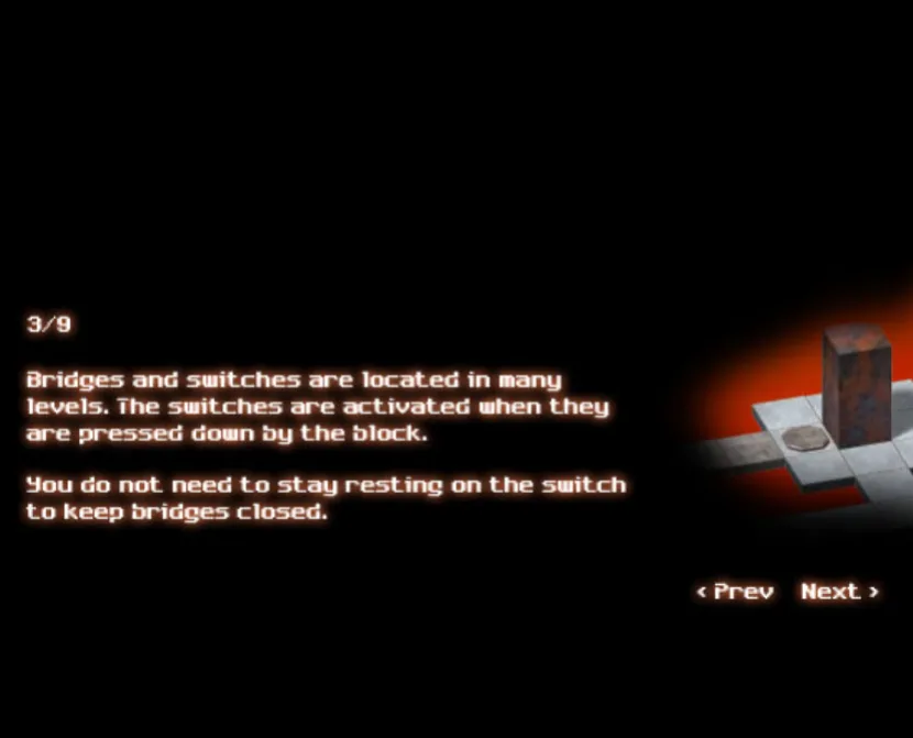 Many levels include switches that operate bridges. When your block presses a switch, it activates the bridge. You don’t need to stay on the switch for the bridge to remain open.