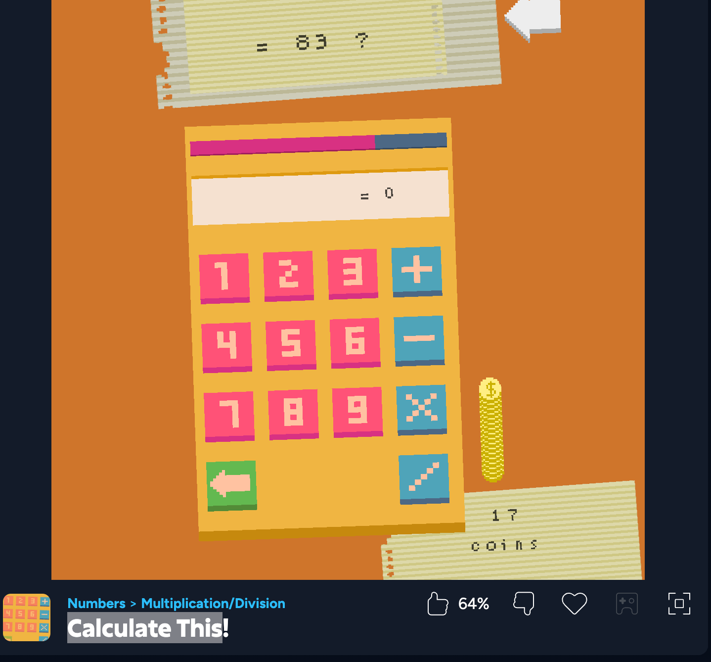 Calculate This is a fun math puzzle game where players use basic arithmetic operations (addition, subtraction, multiplication, division) to reach a target number.