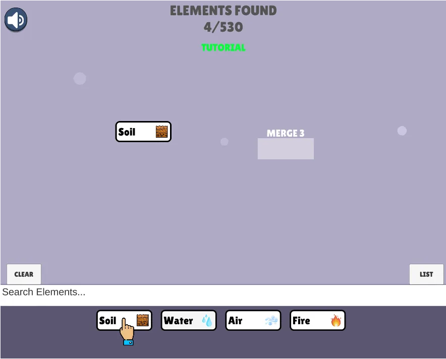 •When two elements can merge, they turn green—drop one onto the other to form a new element.