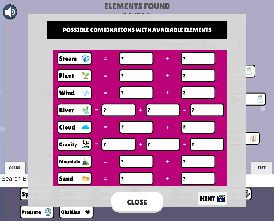 •Use the List button to view available recipes, and the Hint button (after watching an ad) to reveal a valid combination.