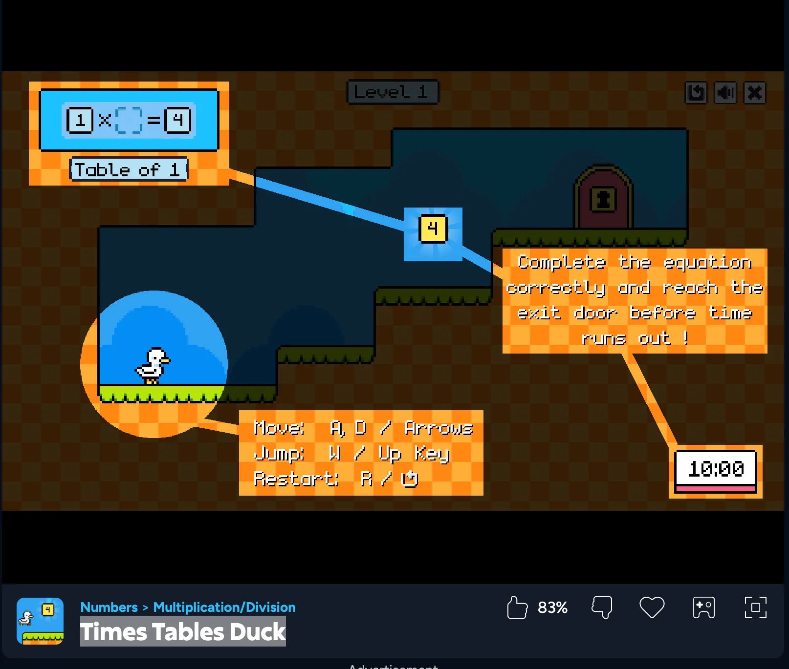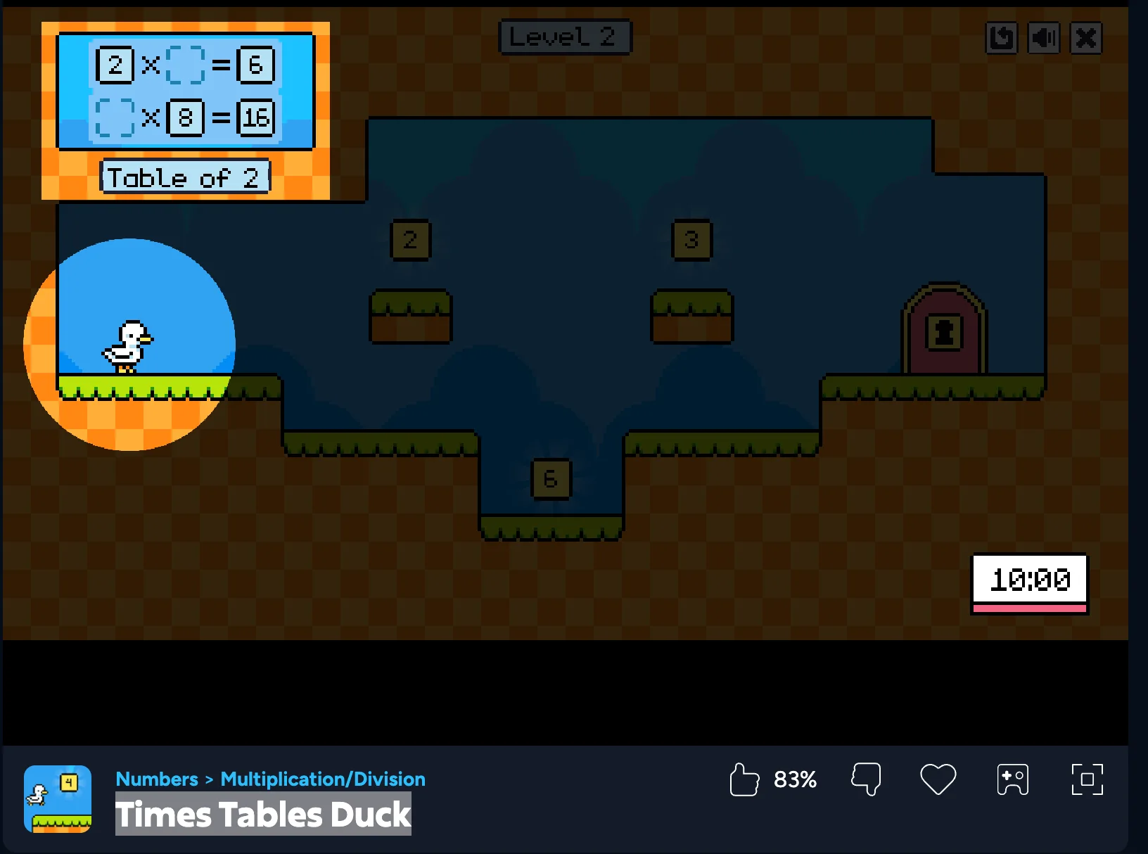 Times Tables Duck is a fun and educational game that helps kids practice their multiplication tables in an exciting way. In the game, you control a duck that must pass obstacles by answering multiplication questions correctly.